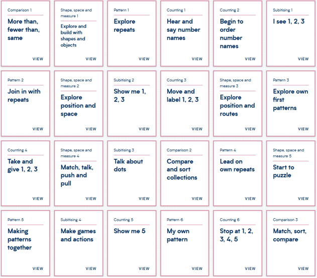 Talk about measure and patterns Circles and triangles Shapes with 4 sides · identify when a set can be subitised and when counting is needed · subitise different arrangements, both unstructured and structured, including using the Hungarian number frame · make different arrangements of numbers within 5 and talk about what they can see, to develop their conceptual subitising skills · spot smaller numbers ‘hiding’ inside larger numbers · connect quantities and numbers to finger patterns and explore different ways of representing numbers on their fingers · hear and join in with the counting sequence, and connect this to the ‘staircase’ pattern of the counting numbers, seeing that each number is made of one more than the previous number · develop counting skills and knowledge, including: that the last number in the count tells us ‘how many’ (cardinality); to be accurate in counting, each thing must be counted once and once only and in any order; the need for 1:1 correspondence; understanding that anything can be counted, including actions and sounds · compare sets of objects by matching · begin to develop the language of ‘whole’ when talking about objects which have parts |